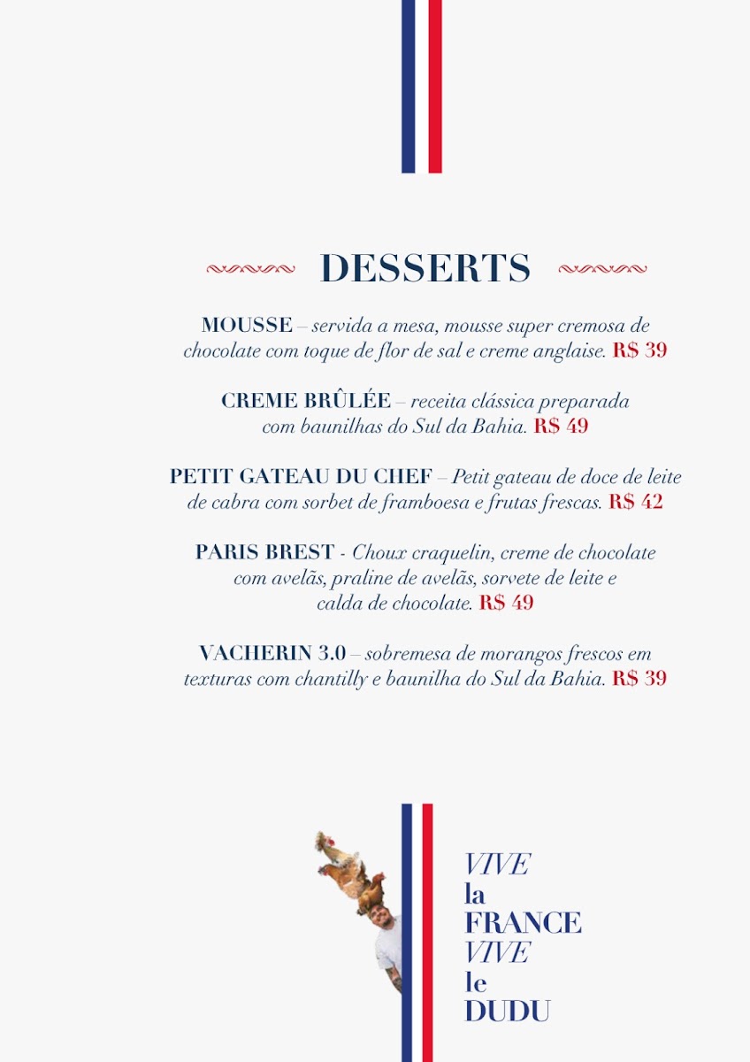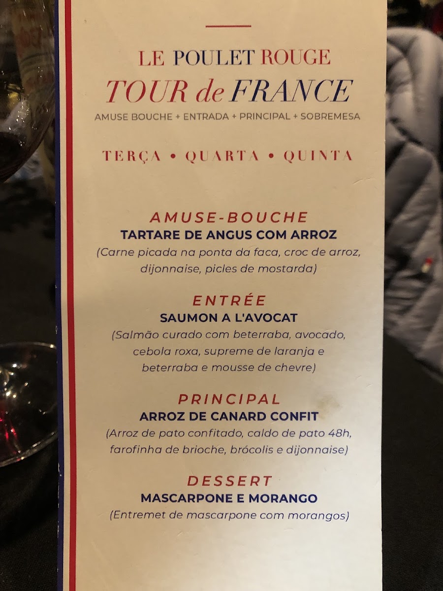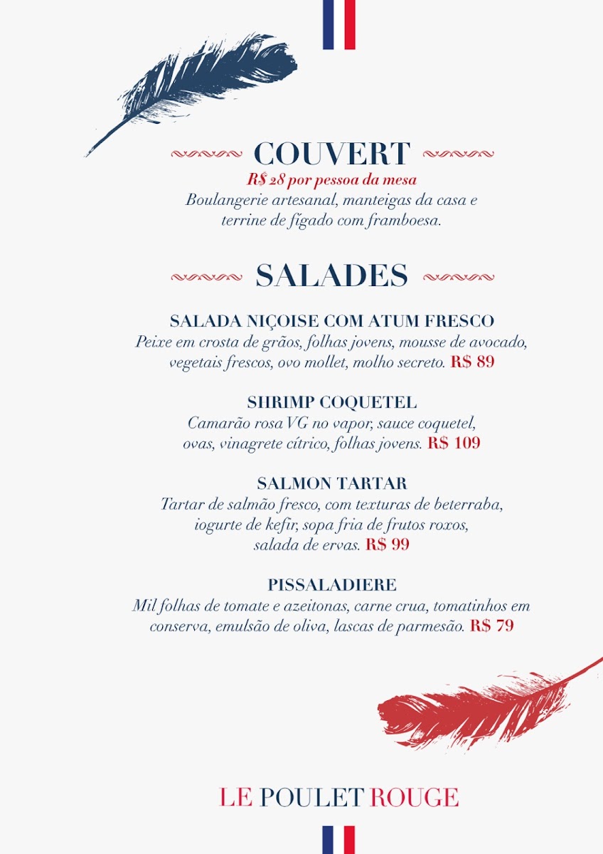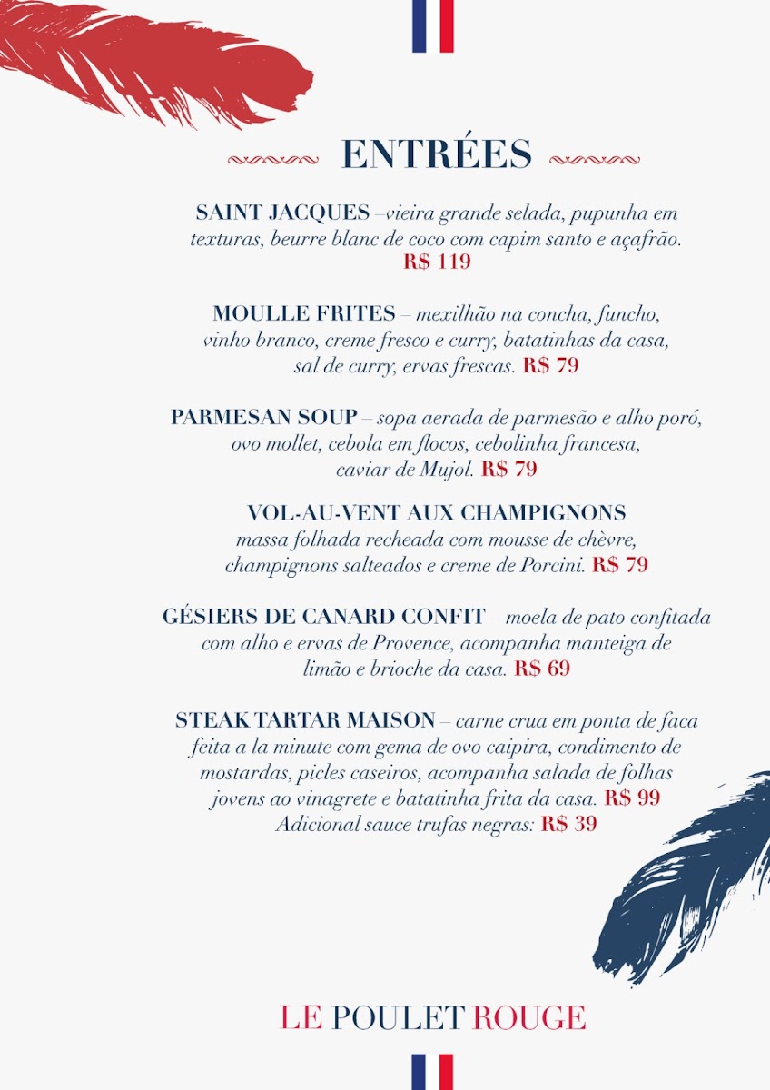 Welcome to Le Poulet Rouge - Restaurante Frances, where modern French cuisine meets the vibrant heart of Balneario Camboriu. Nestled on R. 2550 in the city center, this restaurant promises a culinary journey through exquisite flavors and artful presentations. The menu features a delightful range of salads, including the fresh Salada Niçoise and savory Shrimp Coquetel, each brimming with unique textures and tastes. For entrées, the Saint Jacques offers a perfect sear, complemented by a fragrant coconut beurre blanc. Patrons rave about the exceptional quality, from the airy Parmesan Soup to the rich Moules Frites, paired beautifully with a fine selection of wines and the elegant Santa Augusta Brut sparkling. The welcoming atmosphere and attentive service make each visit a memorable occasion. Prepare to savor each bite and indulge in the enchanting world of French gastronomy at Le Poulet Rouge.